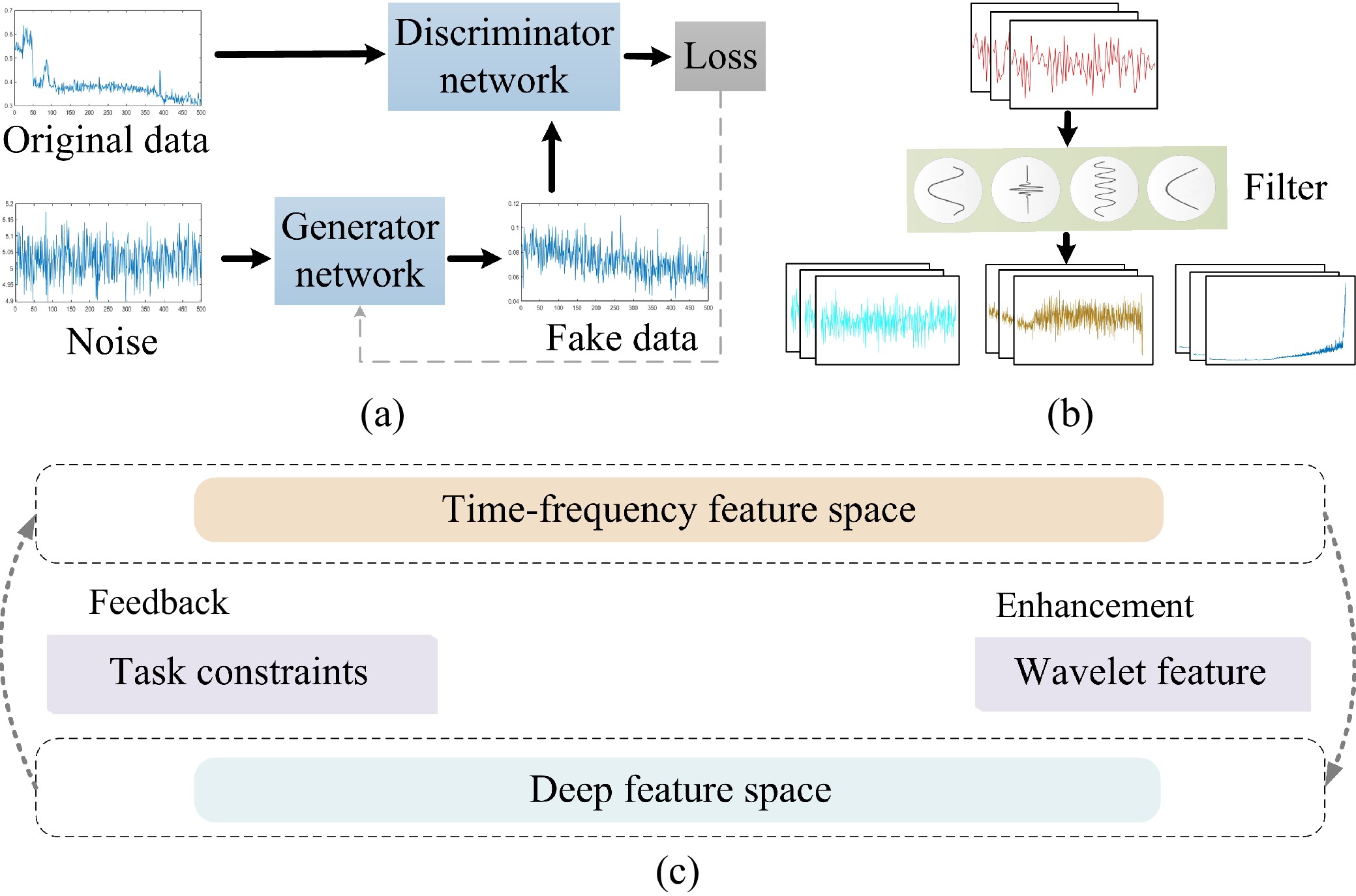 • Deep transfer learning has achieved significant success in anomaly detection over the past decade, but data acquisition challenges in practical engineering hinder high-quality feature representation for few-shot learning tasks. To address this issue, a novel time-frequency-assisted deep feature enhancement (TFE) mechanism is proposed. Unlike traditional methods that integrate time-frequency analysis with deep neural networks, TFE employs a wavelet scattering transform to establish a parallel time-frequency feature space, where a dual interaction strategy facilitates collaboration between deep feature and time-frequency spaces through two operations: 1) Enhancement, where a frequency-importance-driven contrastive learning (FICL) network transfers physically-aware information from wavelet scattering features to deep features, and 2) Feedback, which uses a detection rule adaptation module to minimize bias in wavelet scattering features based on deep feature performance. TFE is applied to a domain-adversarial anomaly detection framework and, through alternating training, significantly enhances both deep feature discriminative power and few-shot anomaly detection. Theoretical analysis confirms that the proposed dual interaction strategy reduces the upper bound of classification error. Experiments on benchmark datasets and a real-world industrial dataset from a large steel factory demonstrate TFE’s superior performance and highlight the importance of frequency saliency in transfer learning. Thus, collaboration is shown to outperform integration for few-shot transfer learning in anomaly detection.