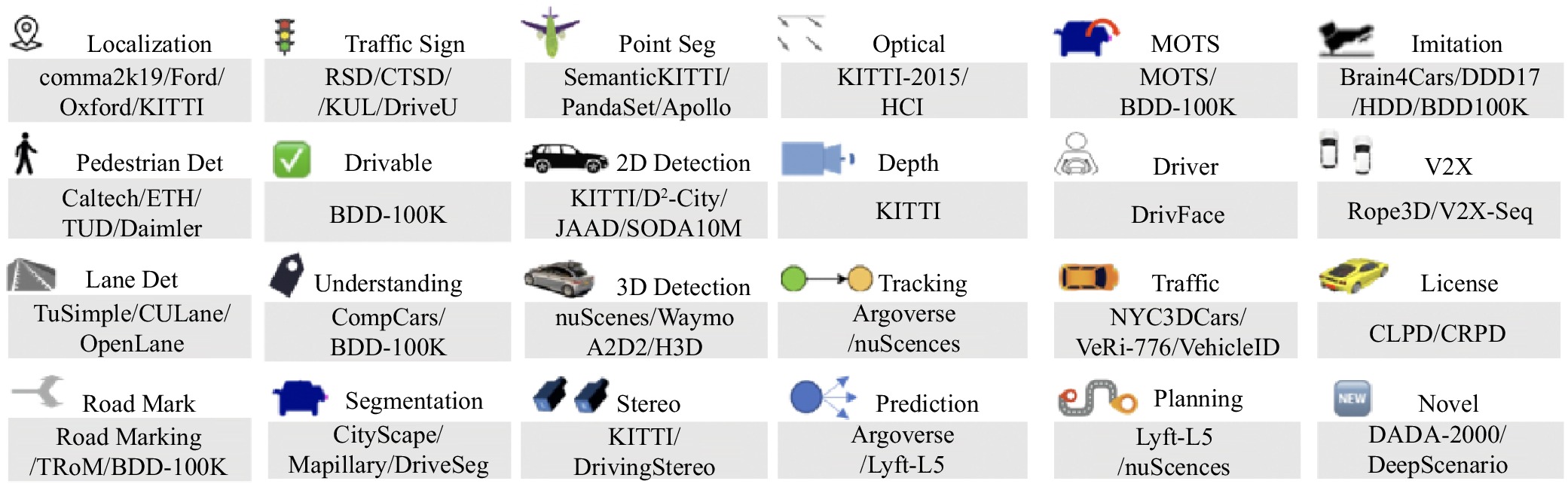• Data-driven autonomous driving is a hot topic in academic and industry research due to its impressive performance, flexible mobility, and reduced human intervention. However, the development of this technology relies heavily on large datasets that contain accurately annotated data, obtained through artificial or semi-automated strategies. Consequently, datasets play a crucial role in autonomous driving, and their characteristics significantly impact the effectiveness of algorithms. Currently, there are several diverse datasets available, such as KITTI and CityScape, that cover various tasks. However, researchers often overlook the unique features, similarities, and specificities of these datasets. Furthermore, to the best of our knowledge, there is a lack of survey articles focusing on special metrics and benchmark performance on different datasets in autonomous driving. Therefore, the purpose of this article is to analyze autonomous driving datasets, guide researchers on collecting and utilizing relevant datasets, summarize evaluation strategies, analyze benchmark performance, and provide future research points to enrich the autonomous driving community. We believe that this work will assist researchers in evaluating their data using suitable metrics and offer a fresh perspective on autonomous driving.