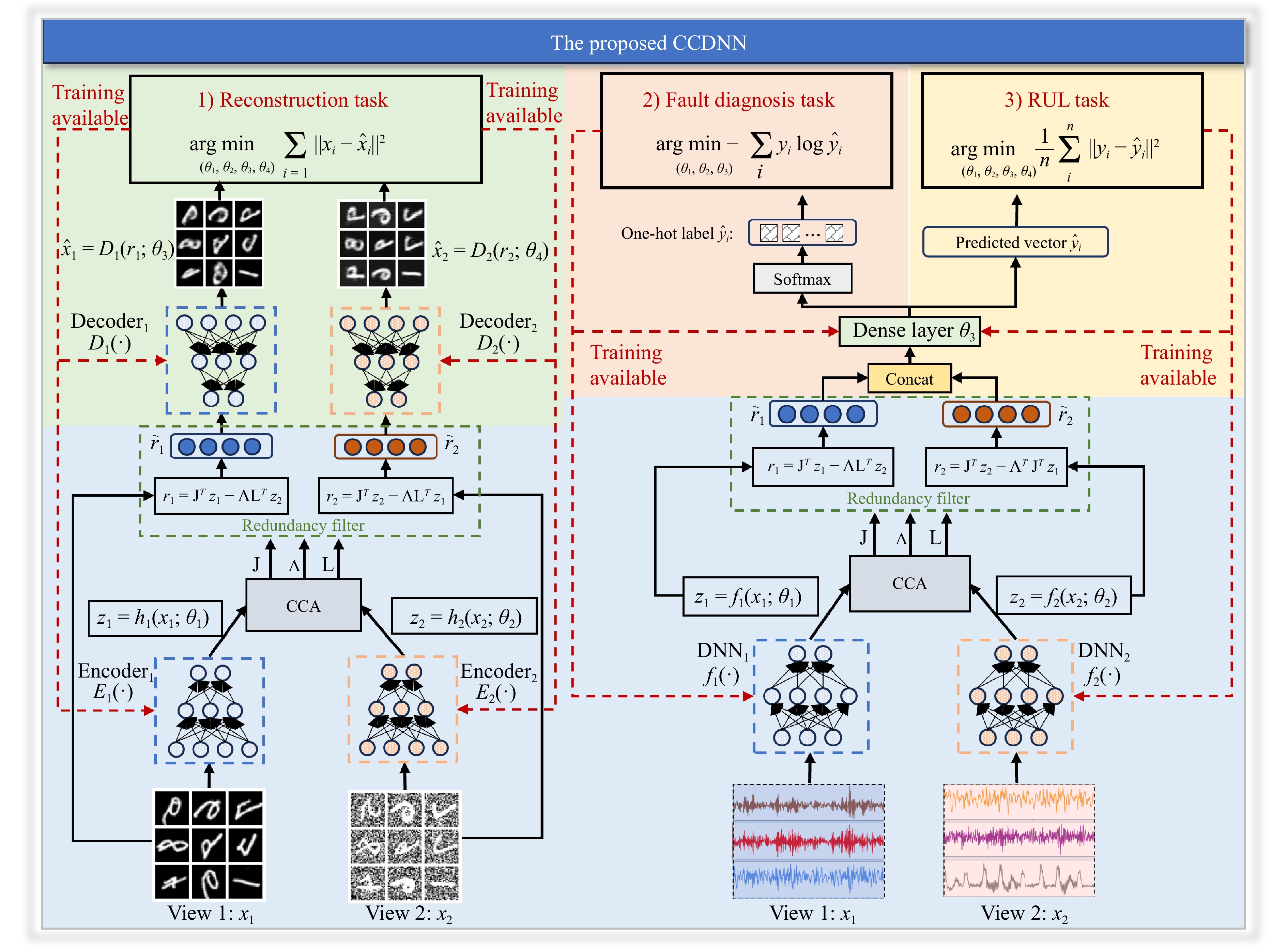 • With the rapid development of Industrial 4.0 and Industrial Internet of Things, the data collection with multi-source has significantly improved. How to effectively fuse these data for various engineering applications is still an open and challenge issue. To this end, we propose the canonical correlation guided deep neural network (CCDNN), a novel deep learning architecture, to learn a correlated representation for multi-source data fusion. Unlike the linear canonical correlation analysis (CCA), kernel CCA and deep CCA, in the proposed method, the optimization formulation is not restricted to maximize correlation, instead we make canonical correlation as a constraint, which preserves the correlated representation learning ability and focuses more on the engineering tasks endowed by optimization formulation, such as reconstruction, classification and prediction. Furthermore, to reduce the redundancy induced by correlation, a redundancy filter is designed. We illustrate its data fusion ability via correlated representation learning and superior performance on various engineering tasks. In experiments on MNIST dataset, the results show that CCDNN has better reconstruction performance in terms of mean squared error and mean absolute error than deep CCA and deep canonically correlated autoencoders (DCCAE). Also, we present the application of the proposed network to industrial fault diagnosis and remaining useful life cases for the classification and prediction tasks accordingly. The proposed method demonstrates approving performance in both tasks when compared to existing methods. Extension of CCDNN to much more deeper with the aid of residual connection is also presented in Appendix.