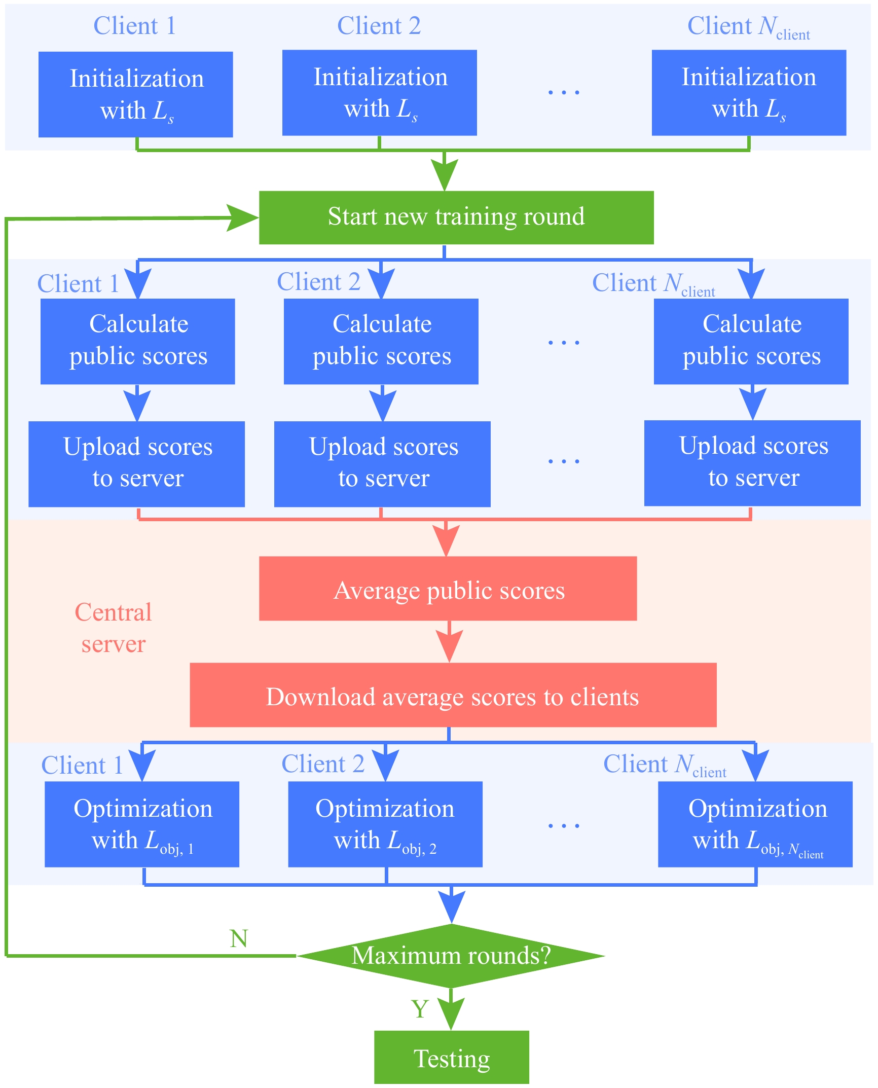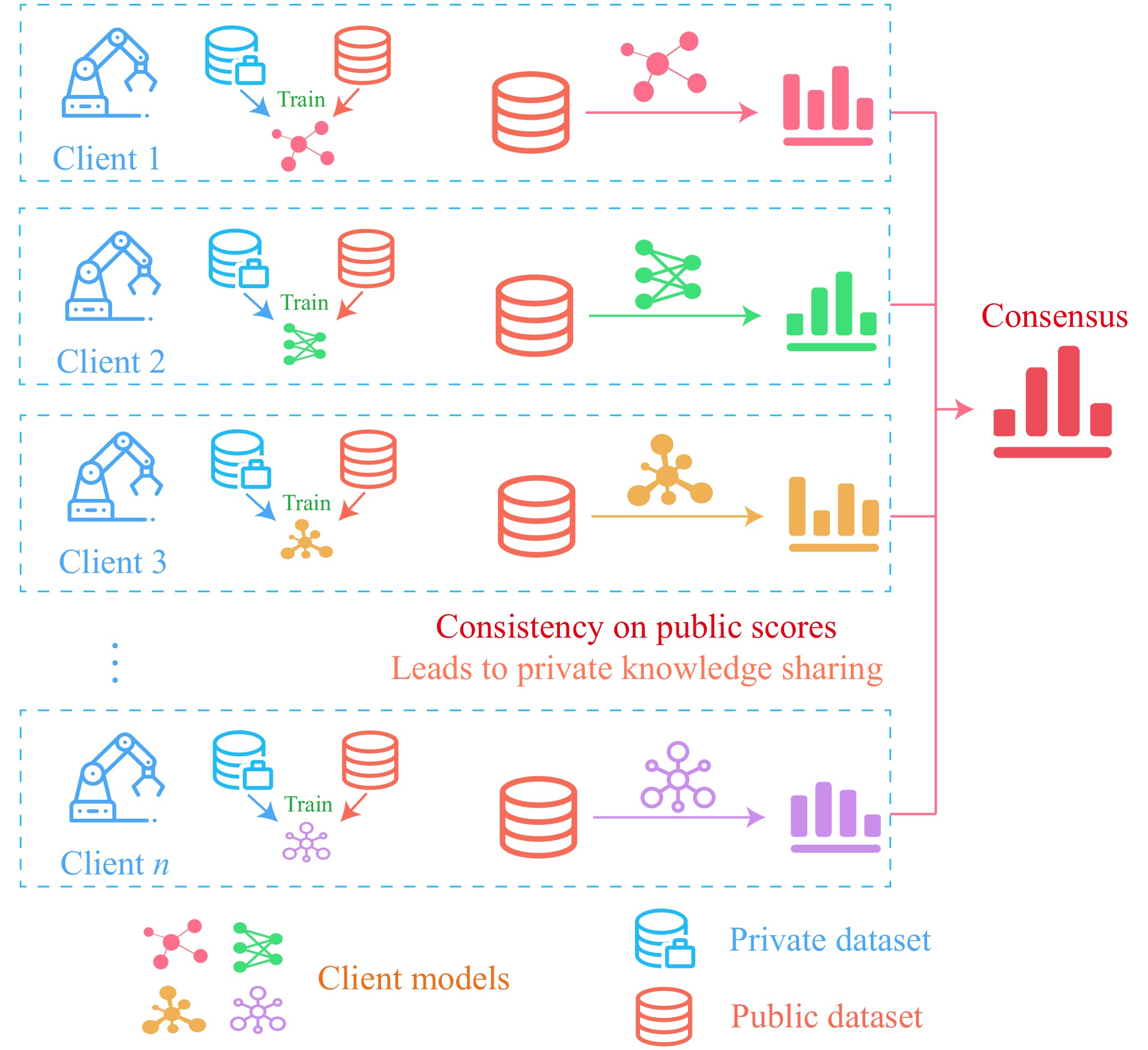 • While data-driven fault diagnosis methods have been successfully developed in the past years, large amounts of high-quality condition monitoring data are generally required to ensure model performance. Due to the high economic and labor costs in data collection, it is difficult for a single user to build an effective database, and exploring data of multiple users for better training becomes a promising solution. However, data privacy is of great importance in the real industries due to conflicts of interest, and direct data aggregation from different users is hardly feasible. To address this issue, a flexible federated learning method is proposed in this paper. Different from most existing methods with identical models under the federation, different customized individual deep neural network models can be used at different clients. Public data are exploited for knowledge transfer. Only the scores on public data are communicated between clients and server, rather than the whole model parameters. That significantly reduces the communication and computational burden. Experiments are carried out on two real-world machinery fault diagnosis datasets, and the results show the proposed method is promising for data privacy-preserving federated learning with flexible models and light communications.